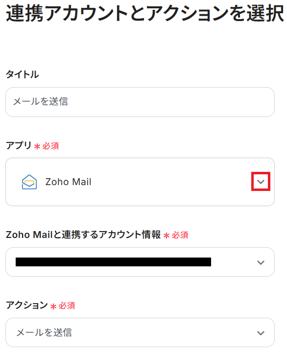 連携アカウントとアクションを選択画面でZoho Mailをクリックし、アプリ一覧からGmailやOutlookなど普段お使いのメールサービスを選択して、該当のアクションを設定してください。