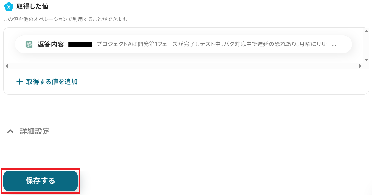 ※ChatGPT(OpenAI)を使ったアクションを動かすには、OpenAIのAPI有料プランに契約しておく必要があります。APIの利用料金が発生した時にスムーズに支払いができるよう、契約内容を整えておきましょう。詳細は、こちらをご確認ください。