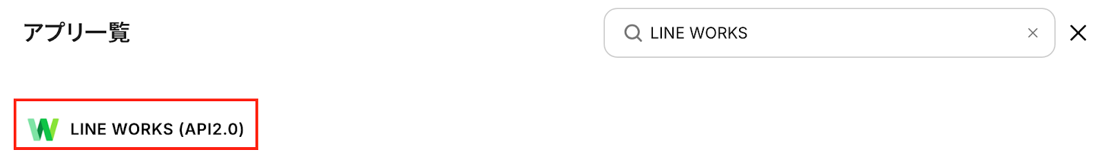 検索窓にLINE WORKSと入力し、表示された候補からLINE WORKS(API2.0)を選択しましょう。