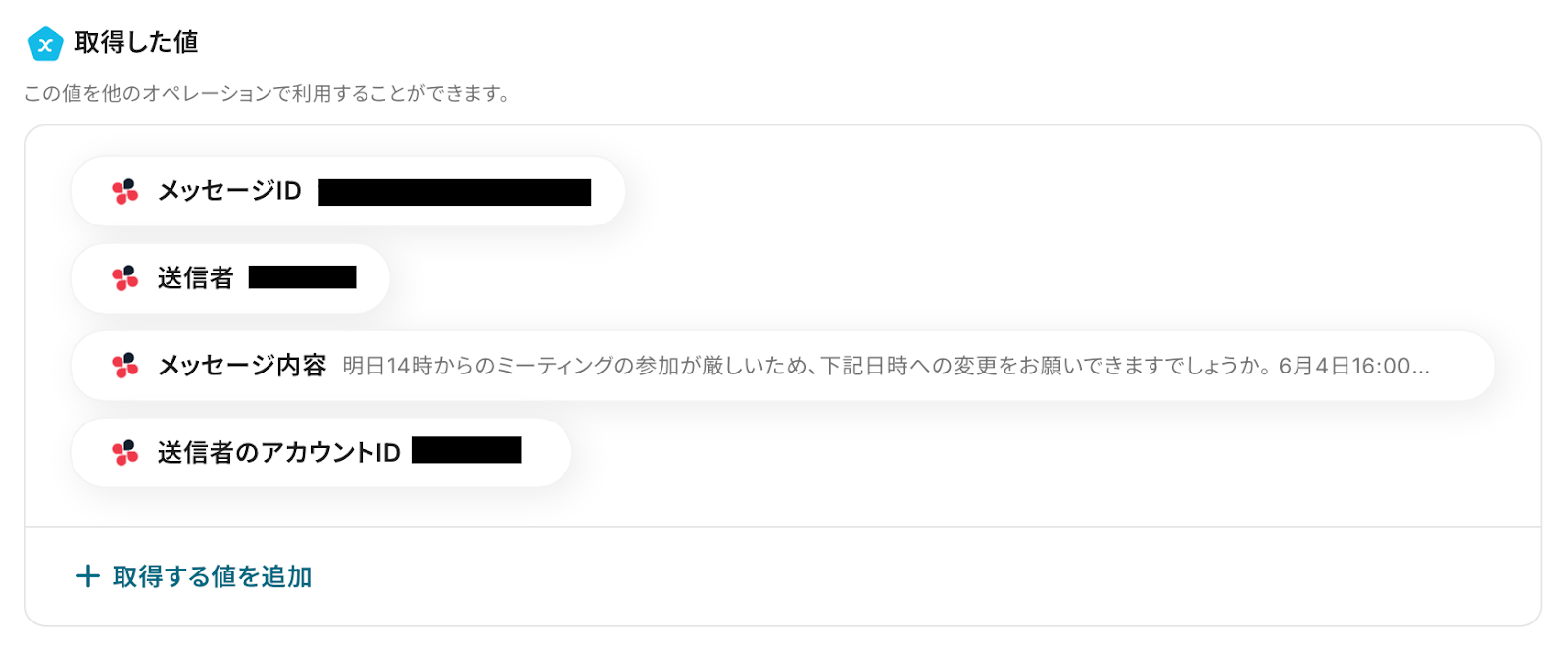 すると、Chatworkから取得した内容が取得した値(アウトプット)に表示されます。