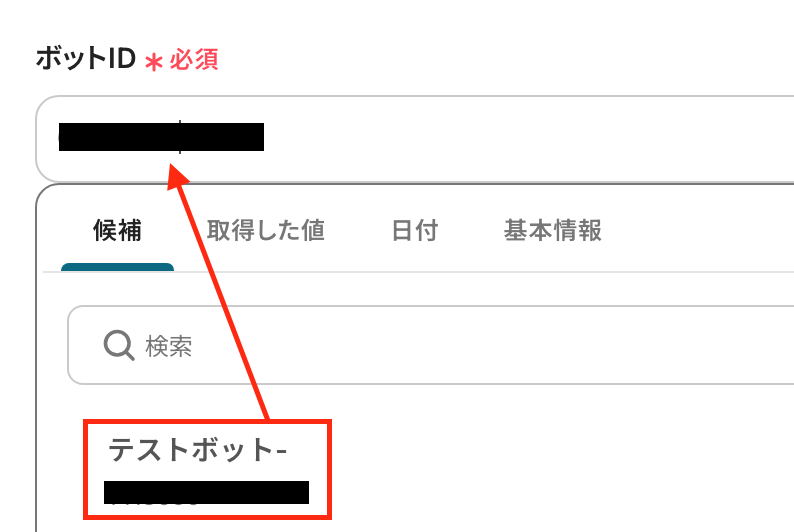 ボットID:ボックスをクリックして表示された「候補」から選択。