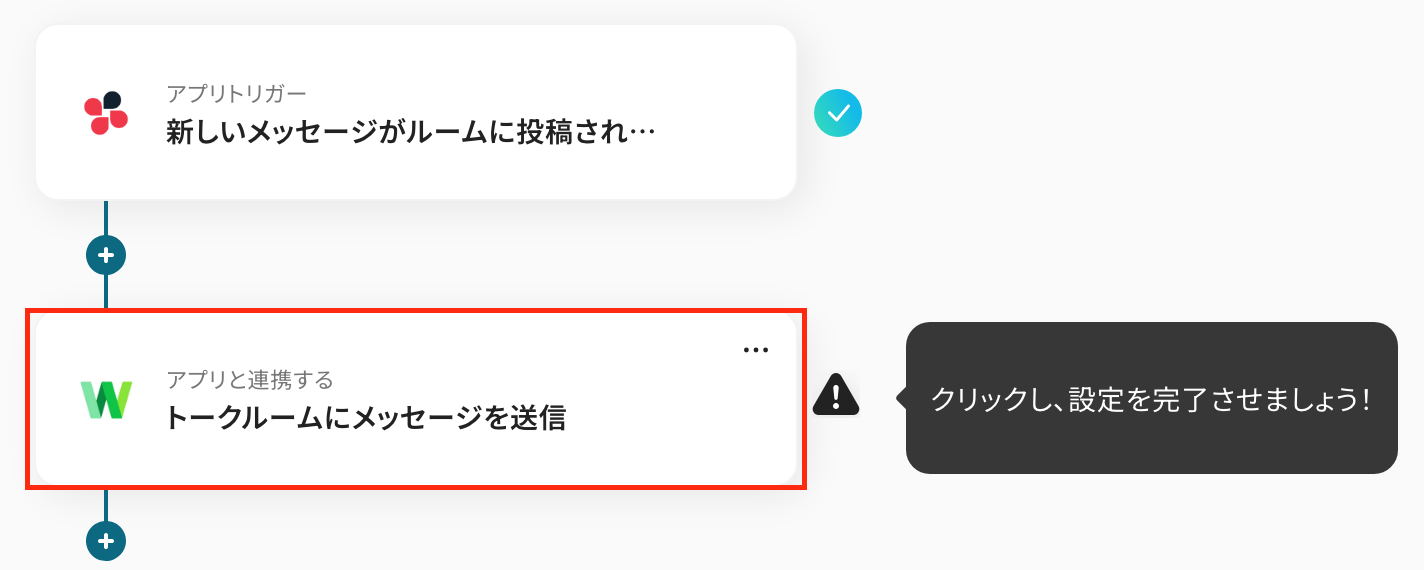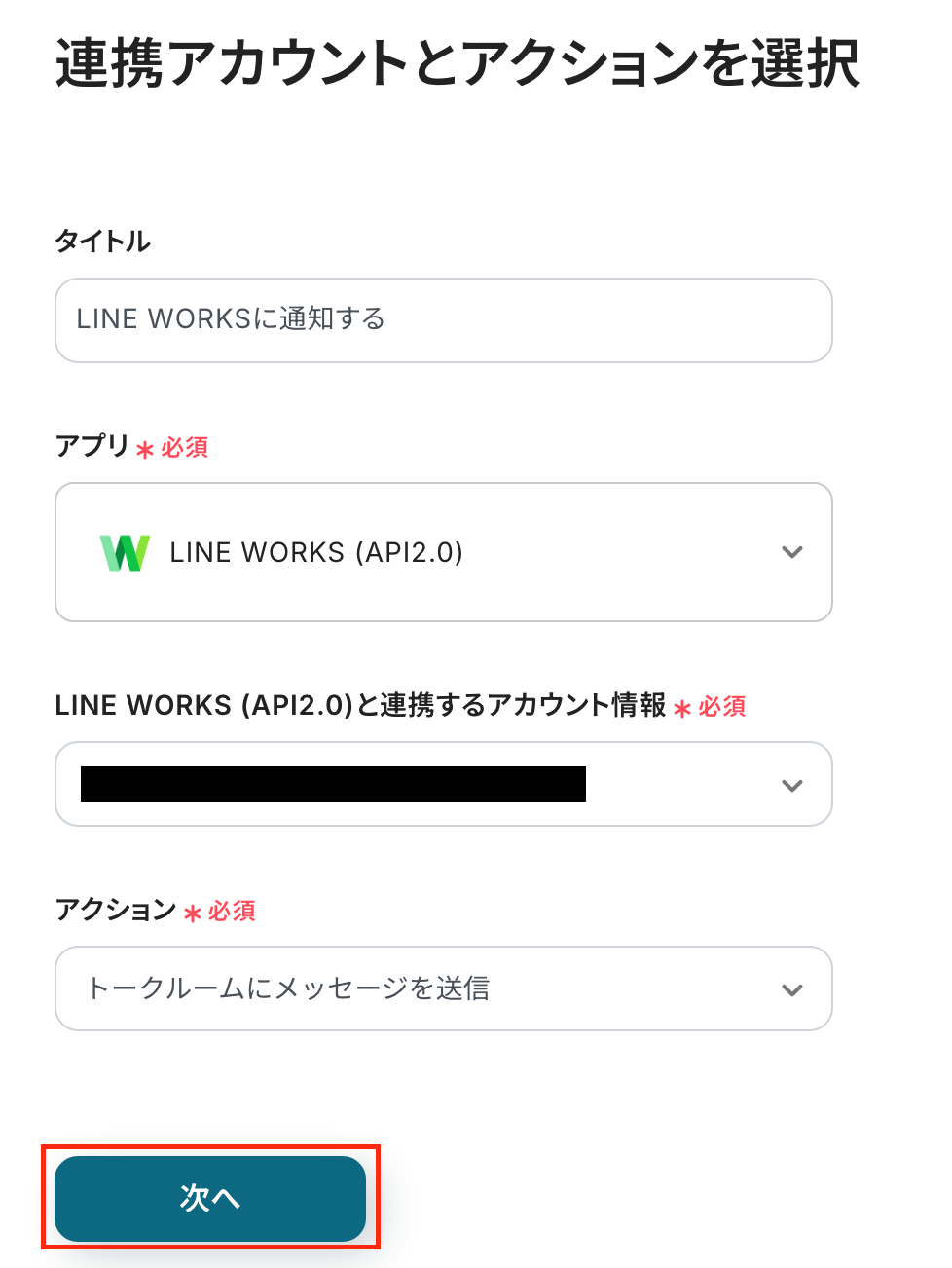 最後の設定です。ここでは、Chatworkに投稿した内容をLINE WORKSに通知する設定を行います。