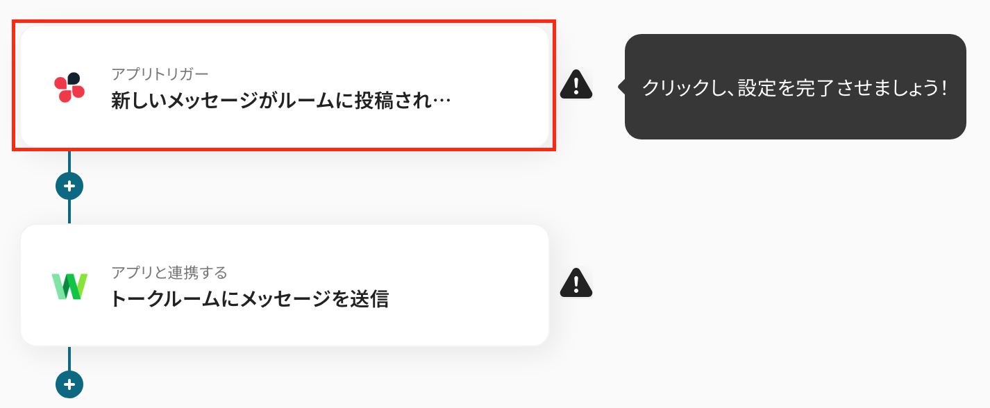 ここから、「LINE WORKSにメッセージが投稿されたらChatworkに通知する」フローを設定していきます。以下の赤枠をクリックしてください。