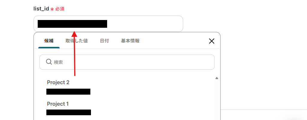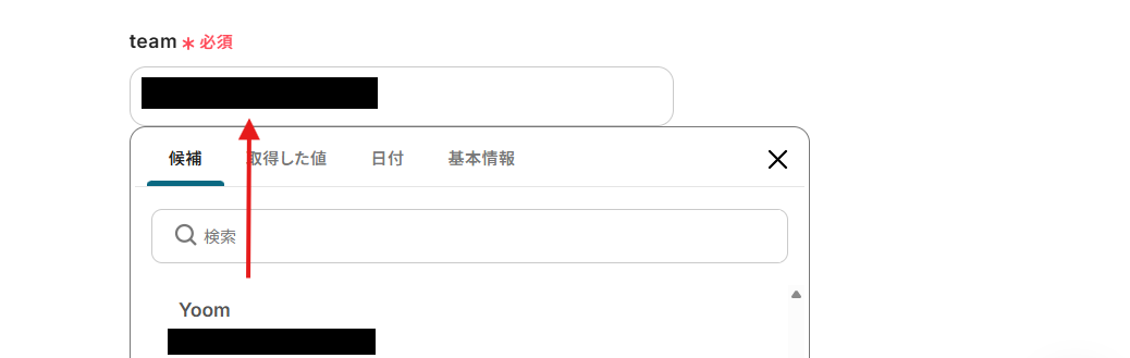 team、space、folder、list_idは、枠内をクリックし表示される候補からそれぞれ設定してください。