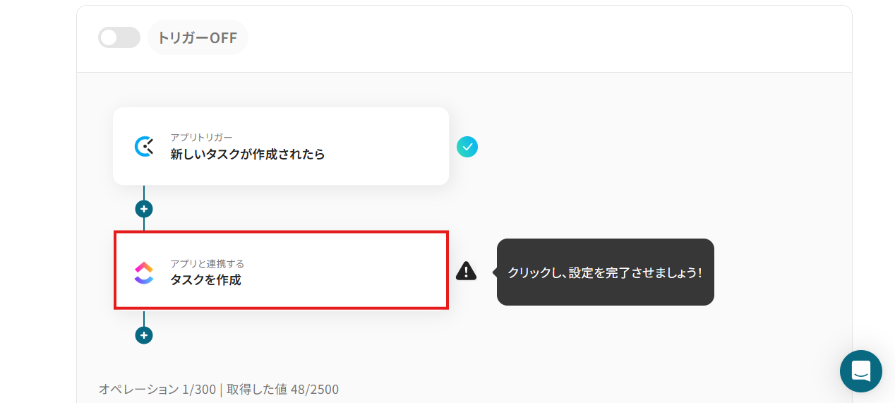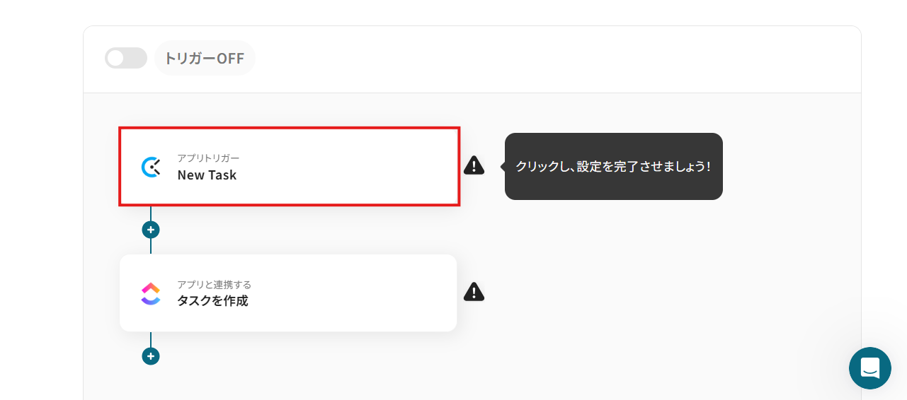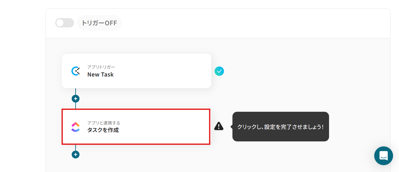 下記画面が表示されたら「トリガーをON」をクリックしてください。 これで、「ClockifyにTaskが作成されたら、ClickUpにも追加する」フローの完成です!