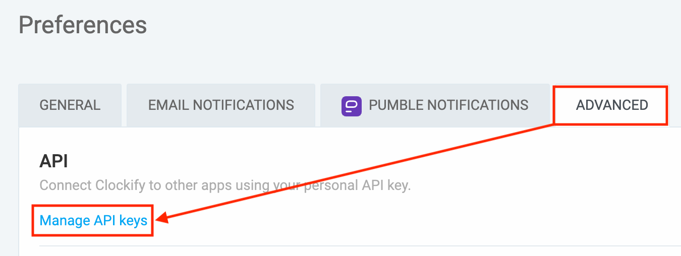 API Keyの確認方法 Clockifyの右上のプロフィールアイコンから「Preferences」を押してください。 表示される画面で「Advanced」をクリックします。 その中にある「Manage API keys」を押してAPIキーを作成してください。