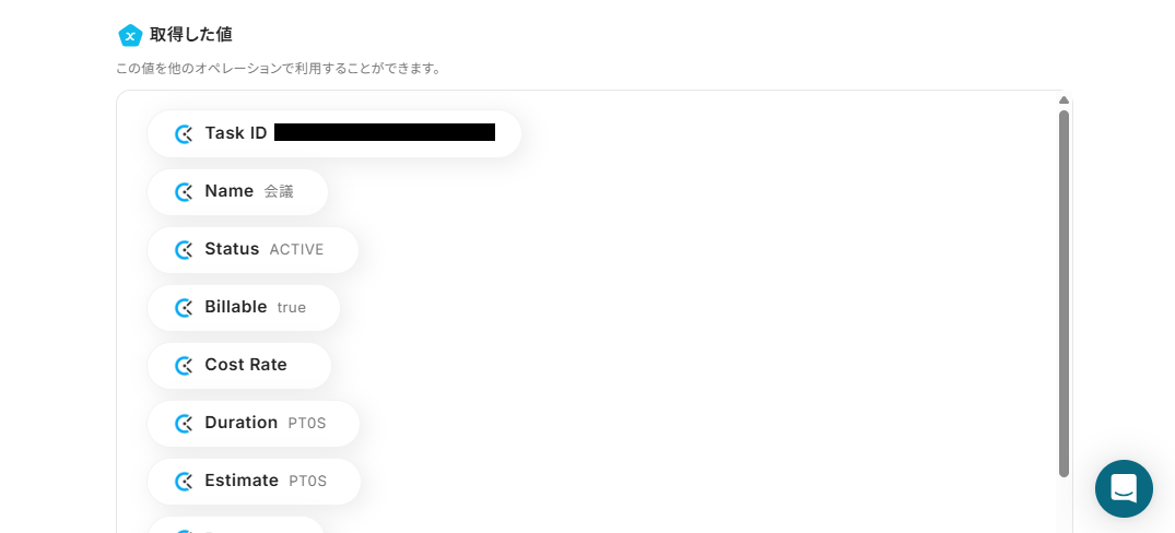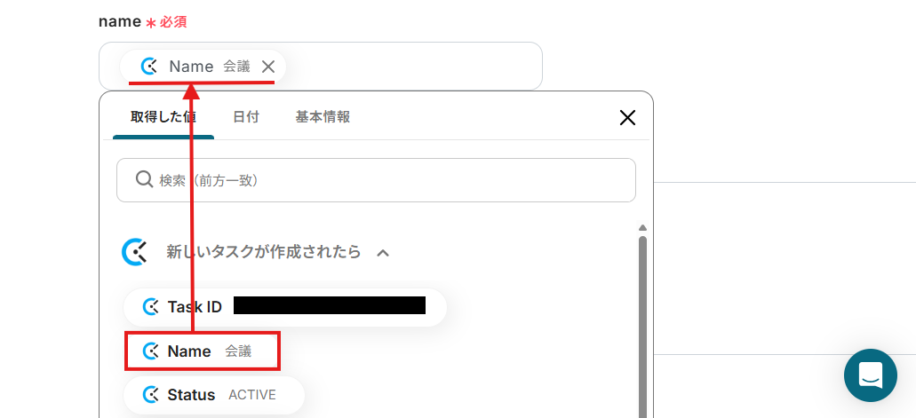 nameは、下記画面の通り設定されています。 この設定により、Clockifyに新規タスクが作成されたら「Name」を取得し、ClickUpの「name」に自動で反映することが可能です。 なお、「取得した値」を活用せず手入力すると毎回名前のタスクが作成されてしまうため注意が必要です。