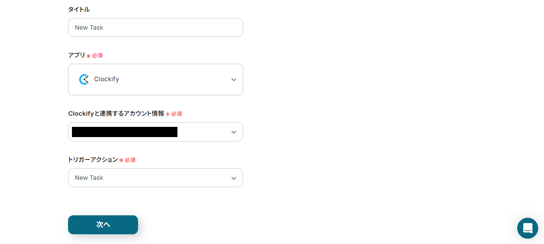 テストを実行し、成功したら「次へ」をクリックしてください。続いて、トリガーの動作テストを行います。Clockifyの先ほど設定したWorkspaceに新しいタスクを作成しましょう。 (架空の情報でOKです!)