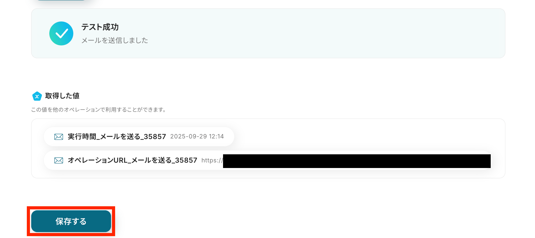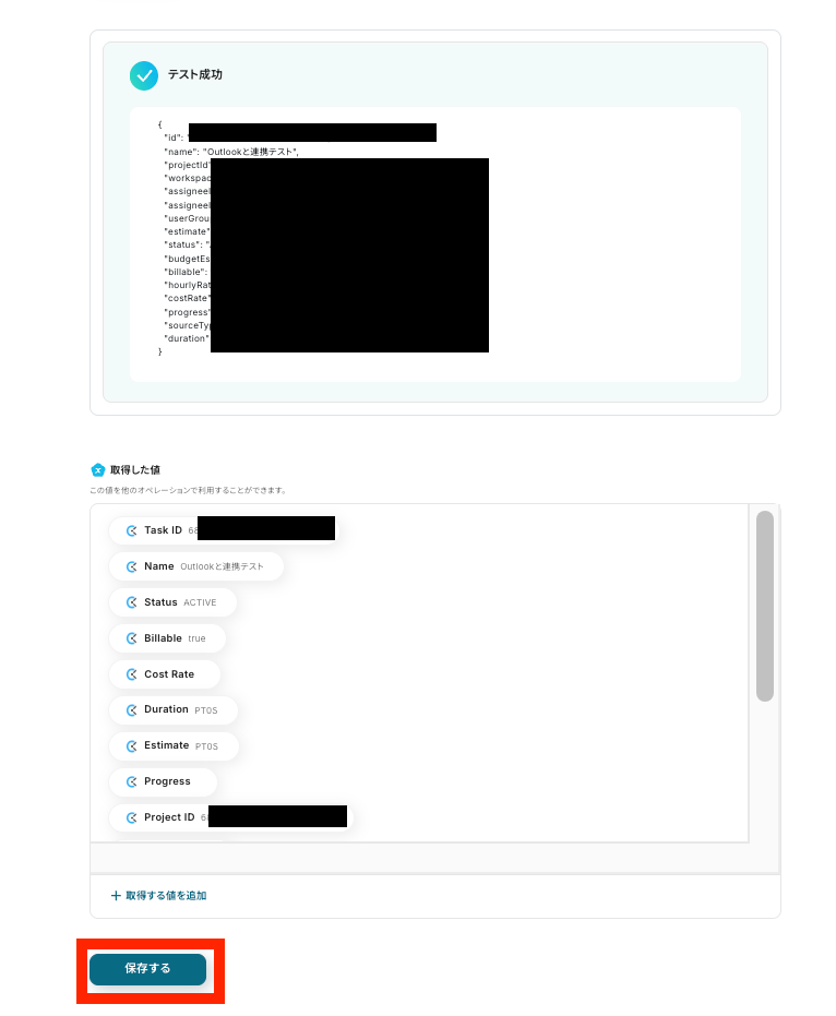 テストに成功したら1番下までスクロールすると「取得した値」の欄にClockifyのタスクデータが反映されているのを確認できます。
