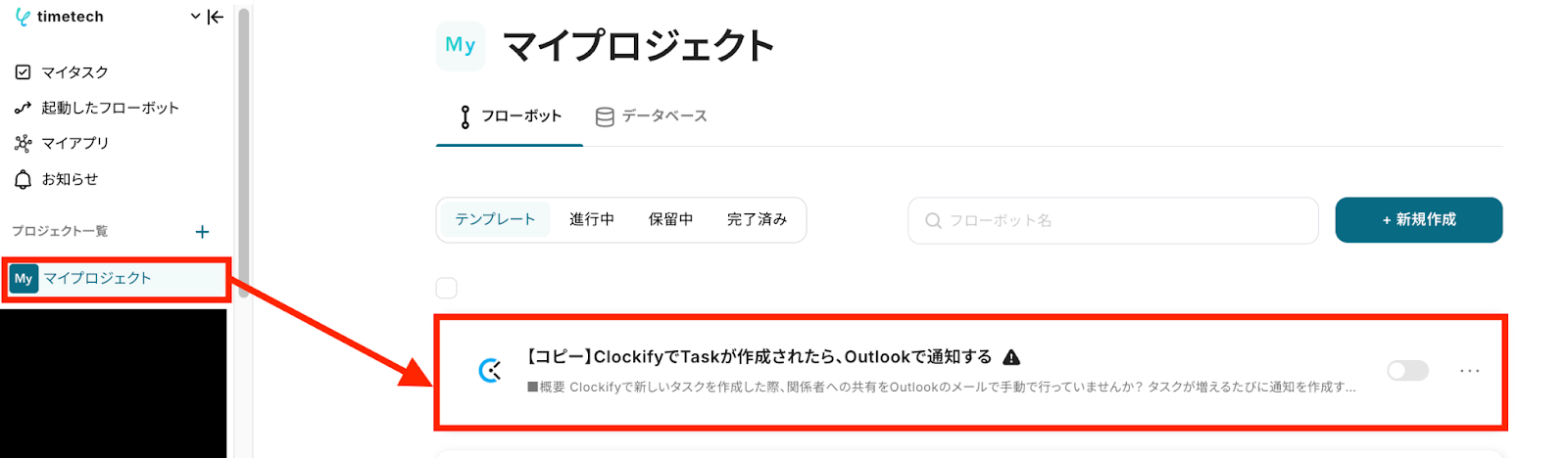 左側にあるメニューの「マイプロジェクト」から、コピーしたテンプレートを開きます。