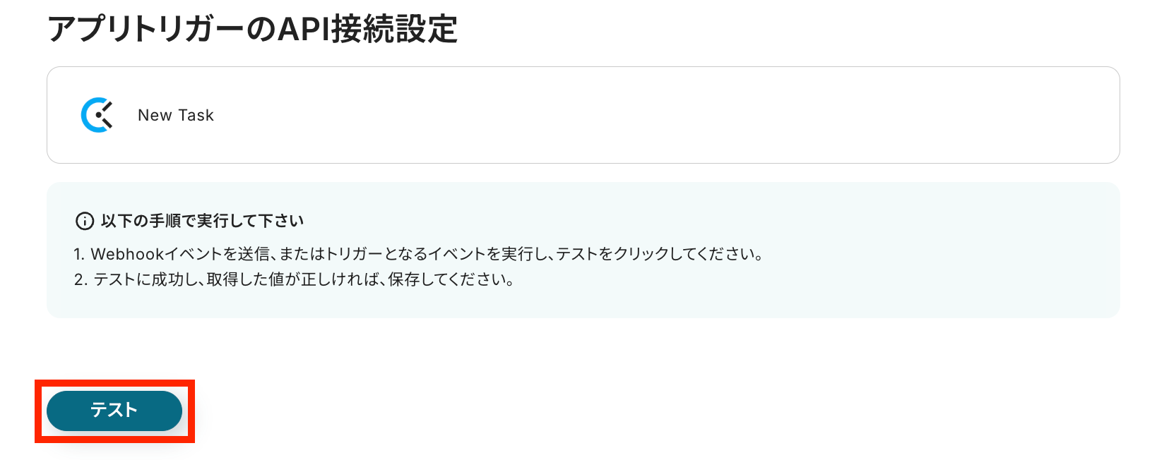 テスト用のタスクの準備ができたらYoomの画面に戻って「テスト」をクリックします。