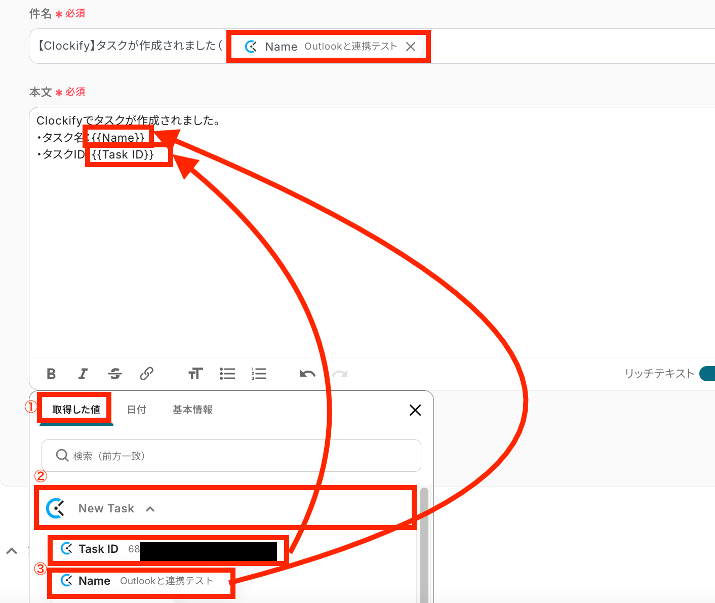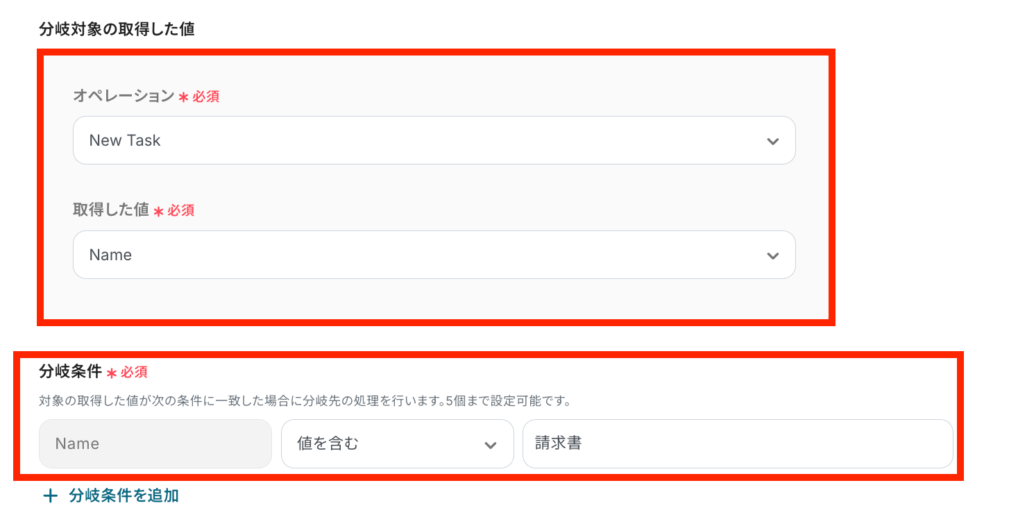 例えば、「請求書」に関するタスクだけをOutlookで通知したい場合は「分岐条件」に請求書を入力することで、請求書というワードが含まれるタスクのみが、後続オペレーションに連携されるようになります。