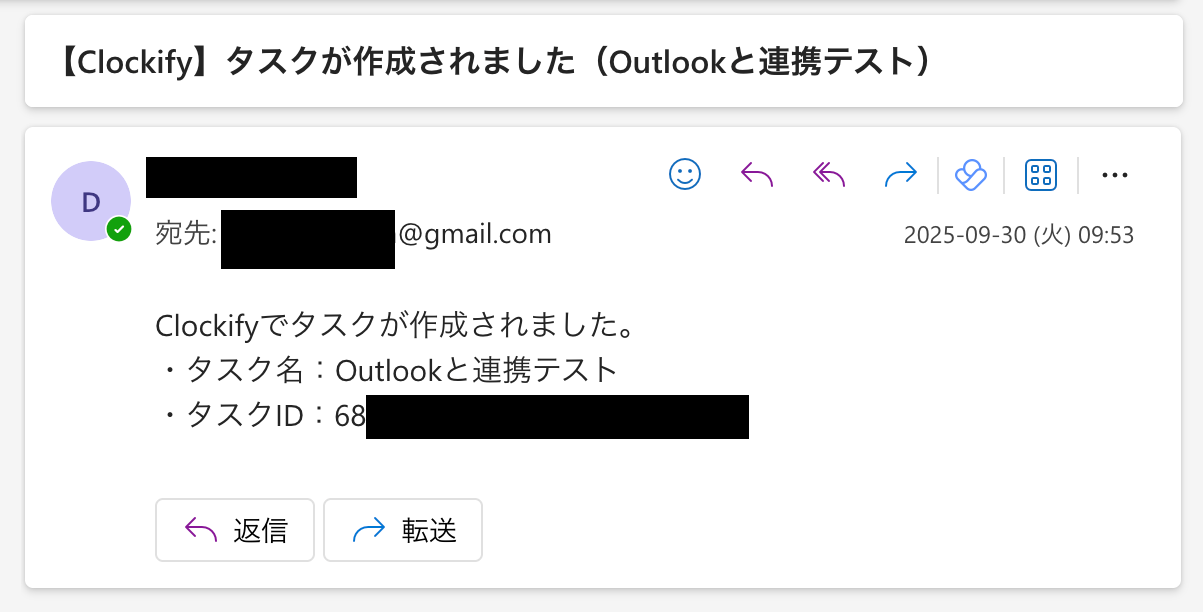 このワークフローを活用すれば、Clockifyでのタスク作成をトリガーに、指定した内容のメールをOutlookから自動で送信できます。