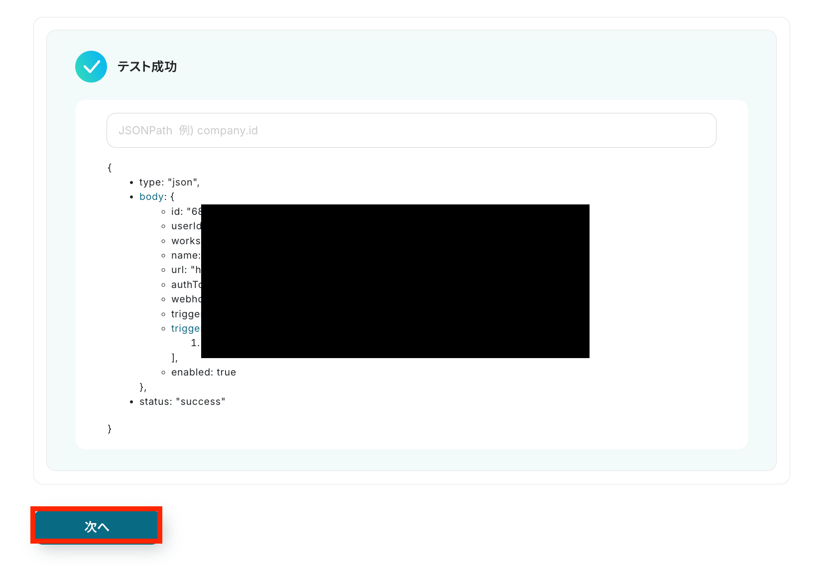 テストに成功すると「テスト成功」の文字とClockifyのデータが表示されるので「次へ」をクリックしてください。