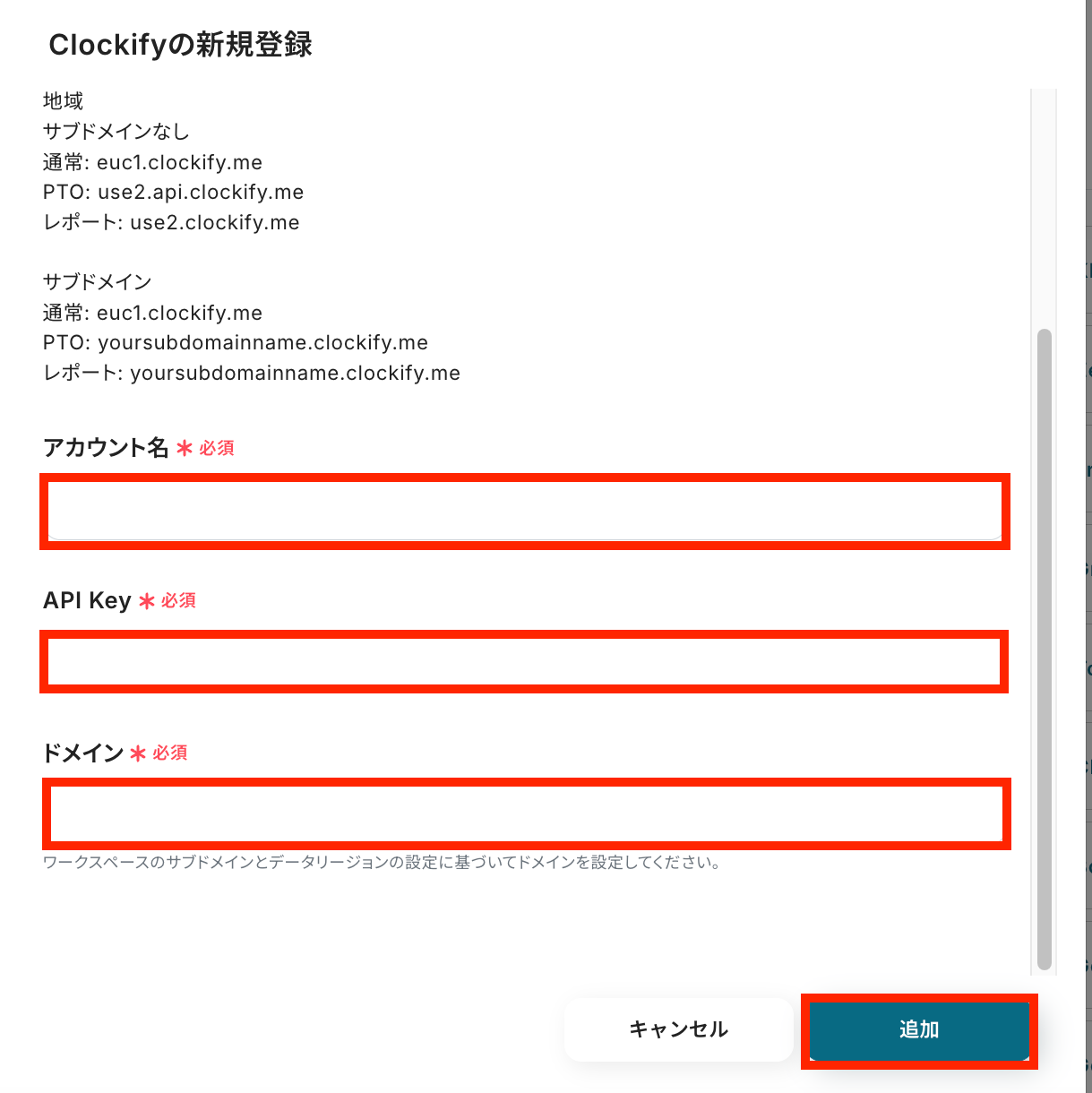 - ドメイン:ClockifyのログインURLからコピーします。(ログインURLがhttps://app.clockify.me の場合は、「api.clockify.me 」と入力すればOKです!)