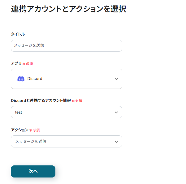 連携アカウントとアクションを選択する画面が表示されるので、今回連携するDiscordのアカウントを確認し「次へ」をクリックします。