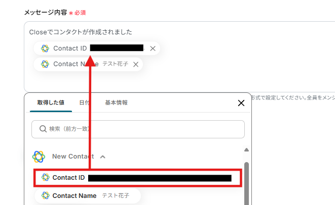 メッセージ内容には以下のようにCloseから取得した値を用いて「Contact ID」と「Contact Name」を入力しました。