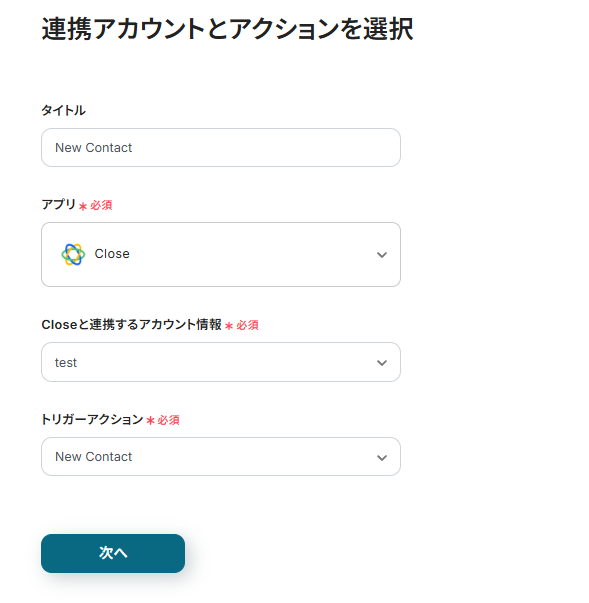 連携アカウントとアクションを選択する画面が表示されるので、今回連携するCloseのアカウントを確認し「次へ」をクリックします。