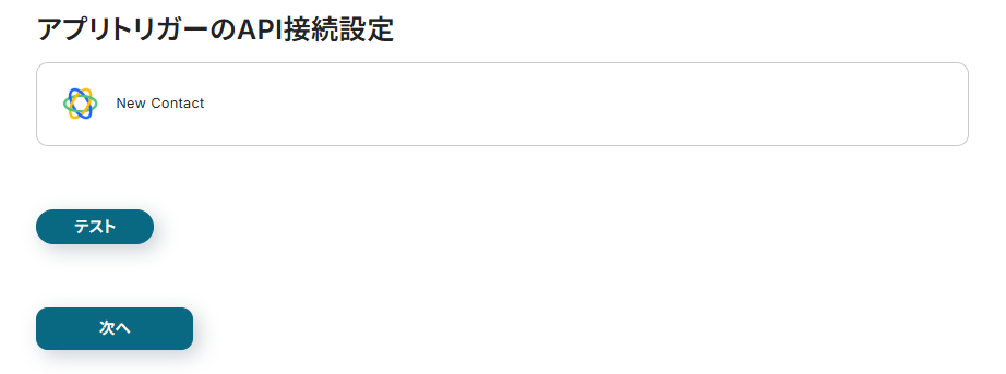 アプリトリガーのAPI接続設定の画面が表示されるので、「テスト」をクリックしアプリの連携ができているか確認しましょう。