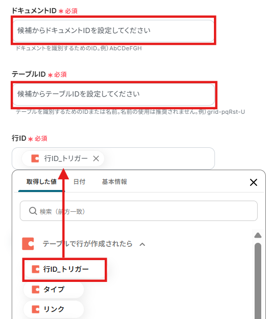 4.「ドキュメントID」と「テーブルID」は入力欄をクリックし、候補から選択しましょう。