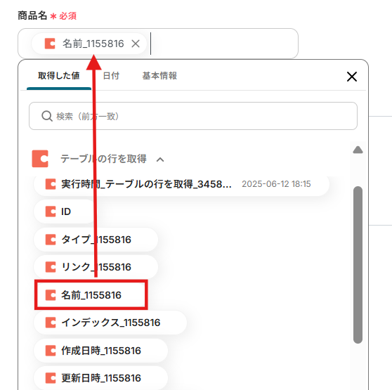 「行ID」は入力欄をクリックしアウトプットから選択します。