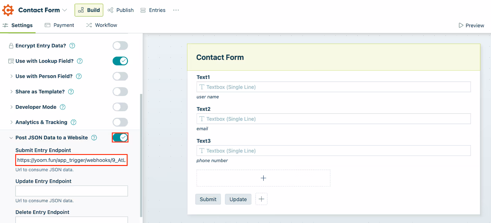 左側に表示されているForm Settingsをスクロールし、表示されるPost JSON Data to a Websiteをオンにします。