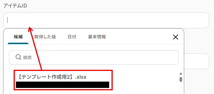 アイテムID:こちらも入力欄をクリックして、先ほど作成したMicrosoft Excelのファイル名を選択しましょう。