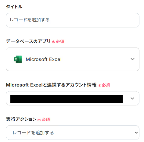 Microsoft Excelの「レコードを追加する」アクションにて、情報を記録したいファイル名とシート名を任意で設定してください。 どの列にどの情報を追加するかを、Mailchimpのトリガーから取得したデータ(メールアドレス、開封日時など)と紐付けて指定します。固定のテキストを入力することも可能です。 ■注意事項