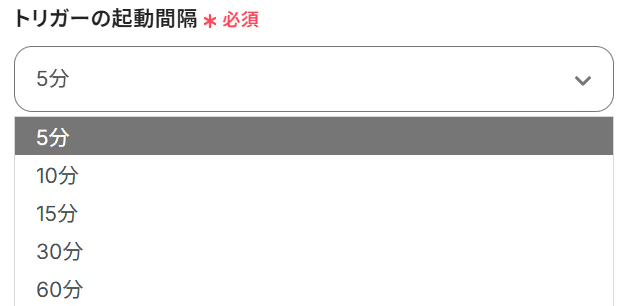 トリガーの起動間隔:5分、10分、15分、30分、60分で設定できます。ご利用プラン によって、設定できるトリガーの最短間隔が違うのですが、基本的にはそのプランの最短の起動間隔に設定しましょう。