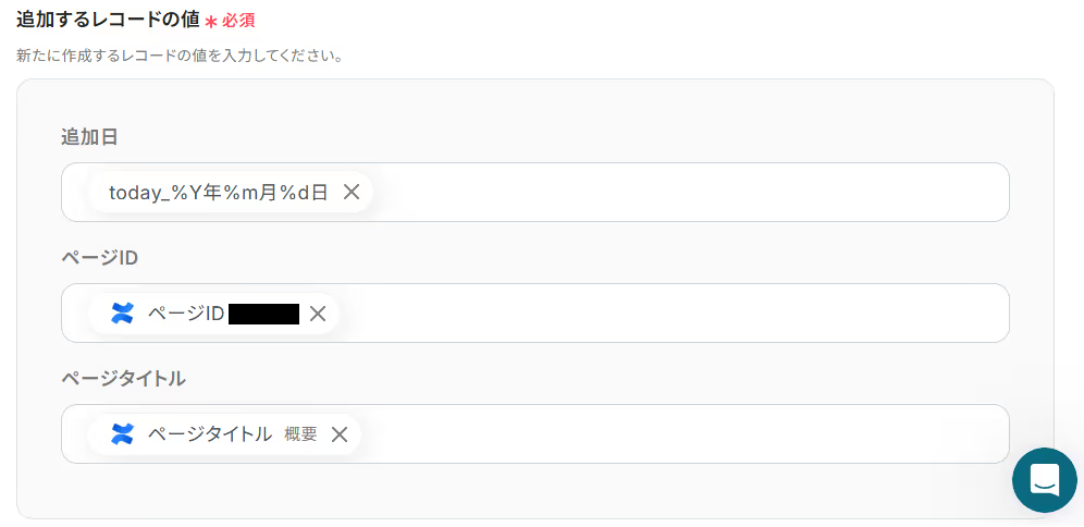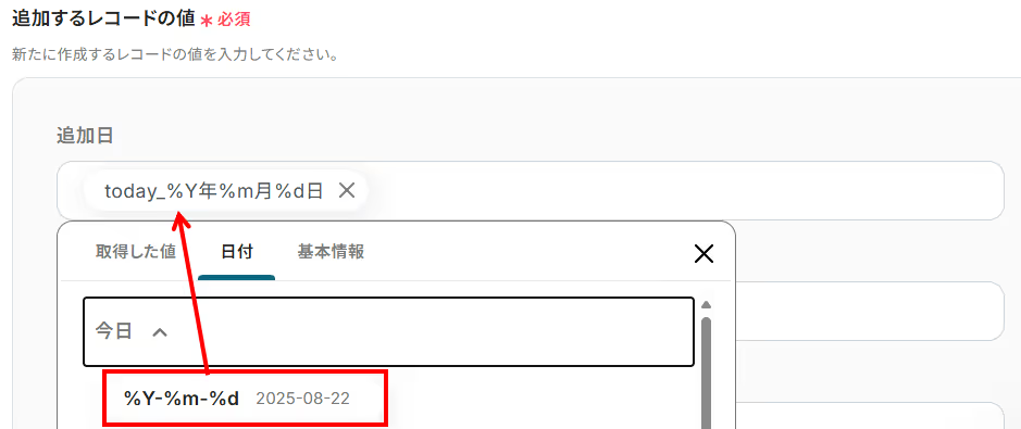 次の画面では、追加するレコードを設定していきます。 それぞれの入力欄をクリックすると、下記のような候補が表示されるのでカスタマイズしてください。 例えば、「日付」タブを選択することで追加した日付を動的に設定することが出来ます。
