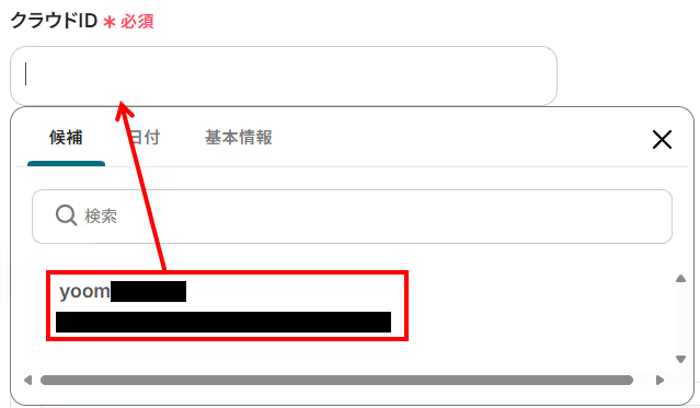 クラウドID:入力欄を選択すると、候補が表示されるので対象のクラウドIDを選択してください。