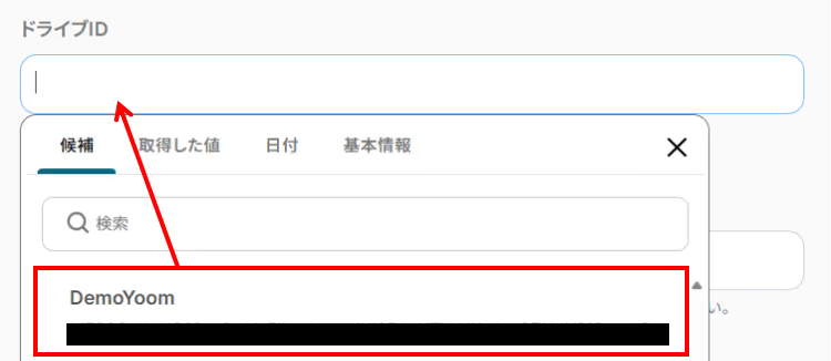 ドライブID:入力欄をクリックすると、下記のように候補が表示されますので、対象のドライブIDを選択してください。