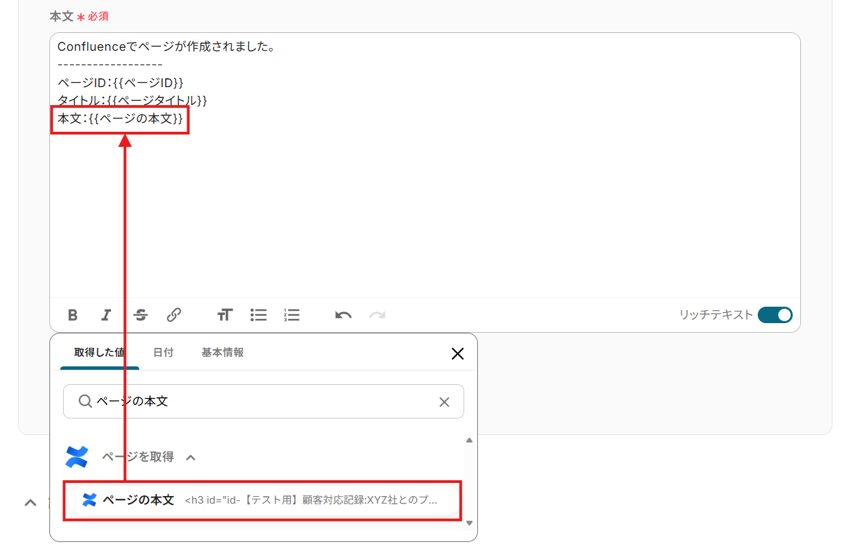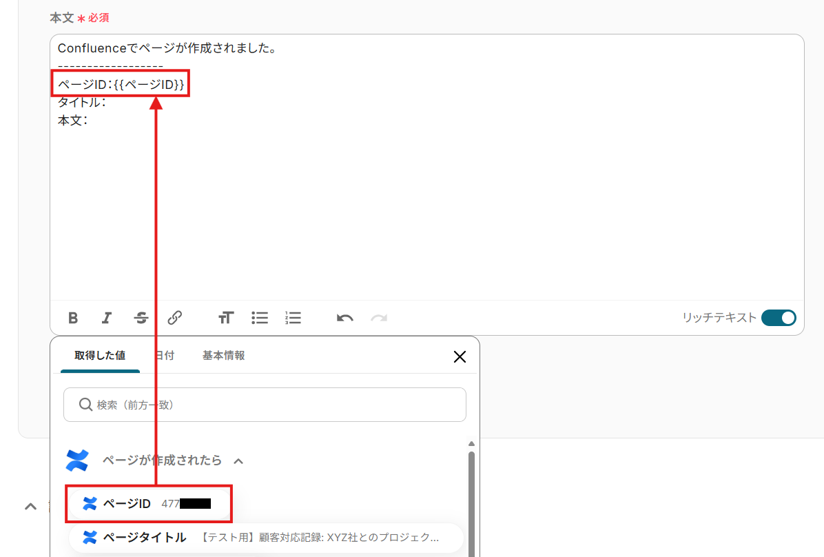 - 「コンテンツID」にはデフォルトで、トリガーアクションで取得したページのIDが設定されています。