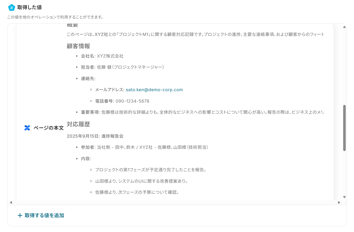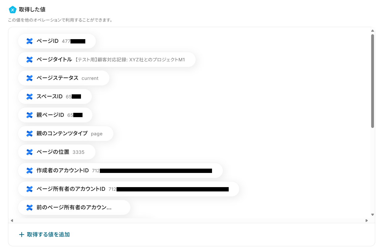 - テストに成功すると、「取得した値」に最新のページのID情報などが追加されます。