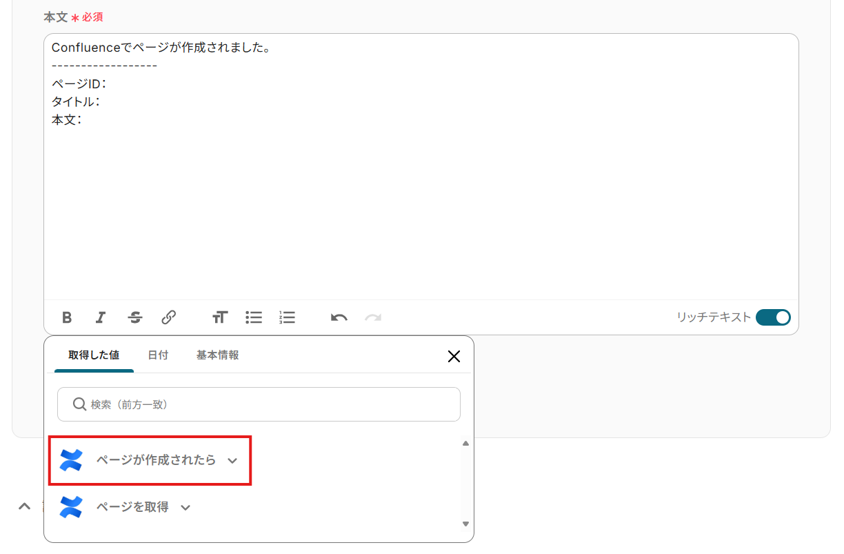 - Confluenceの「ページが作成されたら」をクリック。