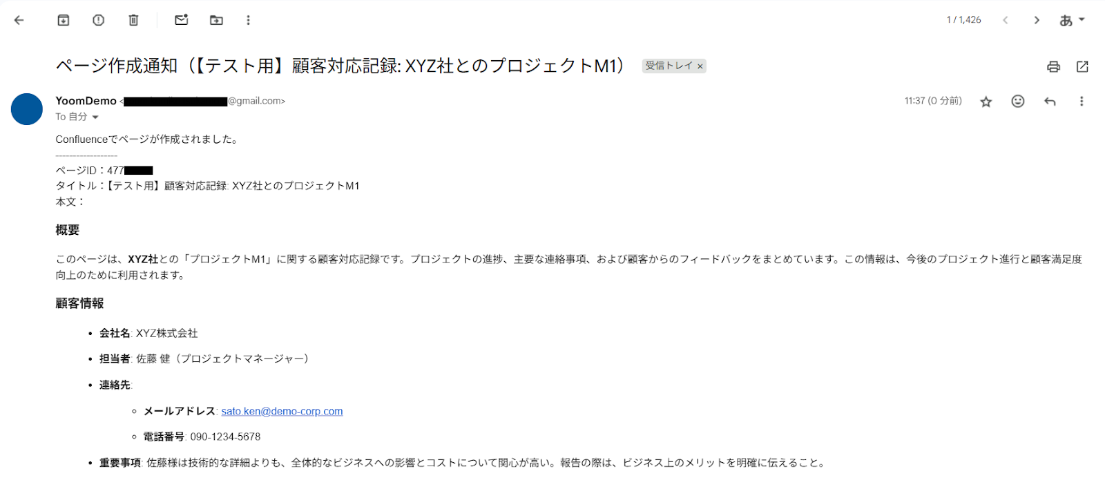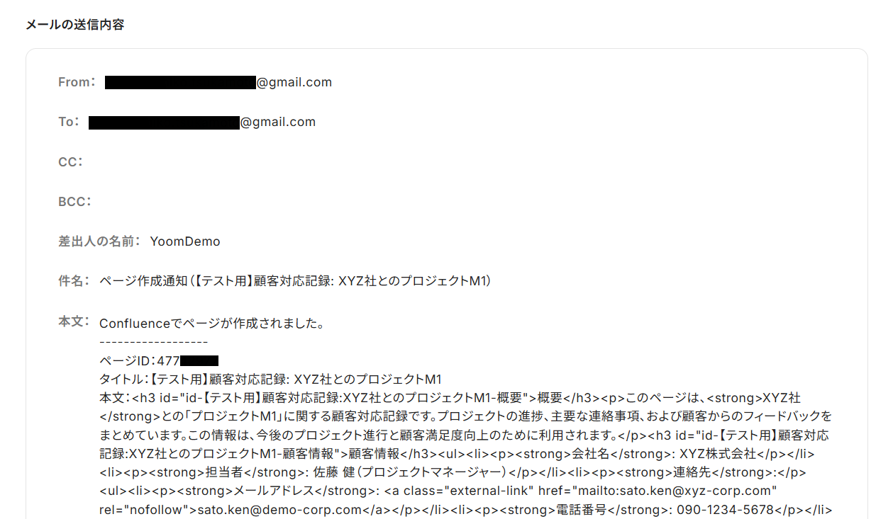 Confluenceに新規ページを作成し、その情報を含むメールがGmailから指定の宛先に自動で送信されていれば成功です。