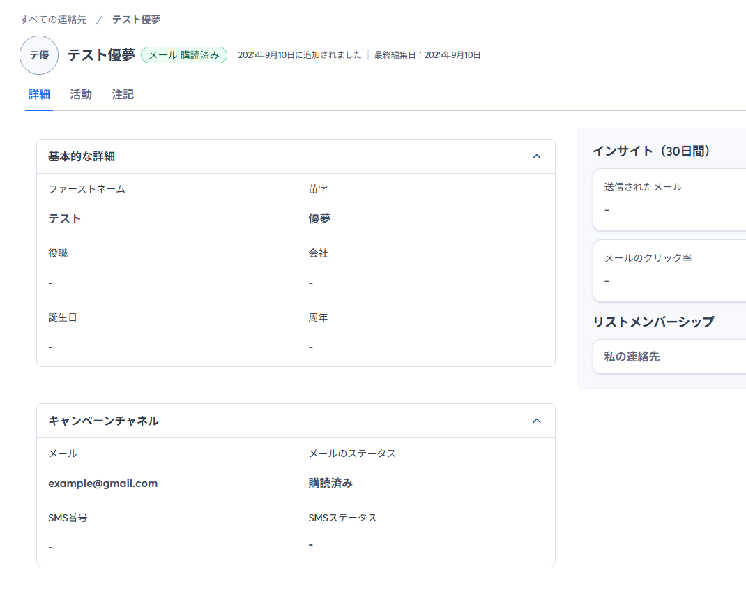 フローの作成を始める前に、あらかじめYoomと連携するConstant Contactに、Contactを作成しておきましょう!