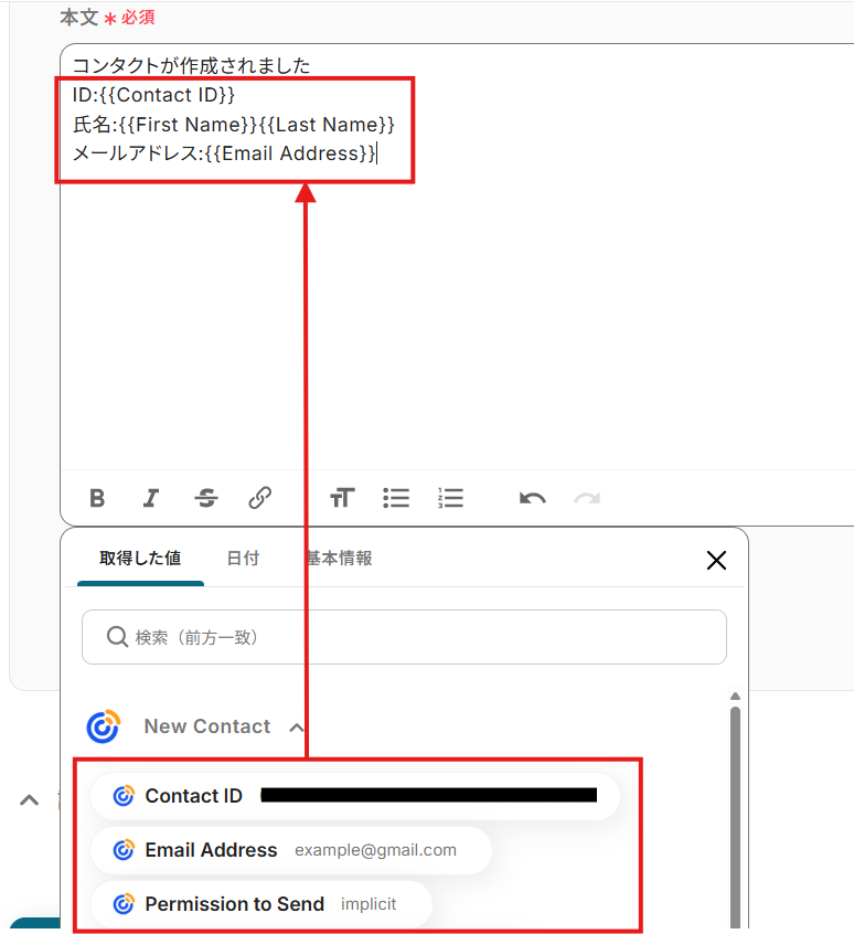 登録したContactにメールを送りたい場合は、取得した値からコンタクトのメールアドレスを設定してください。