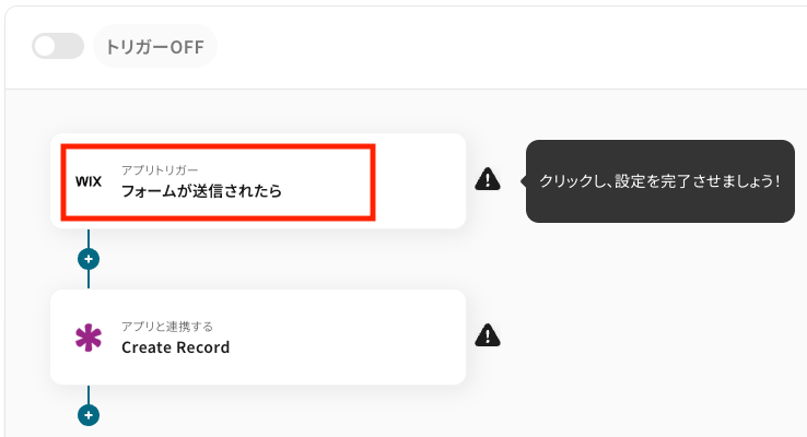 このステップでは、Wixのフォームから送信された情報を、Knackの指定したテーブルに自動で登録する設定を行います。 フロー内の「Create Record」をクリックしてください。