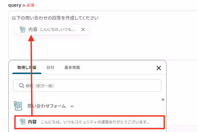 queryには以下のようにフォームから取得した内容を入力することができます。