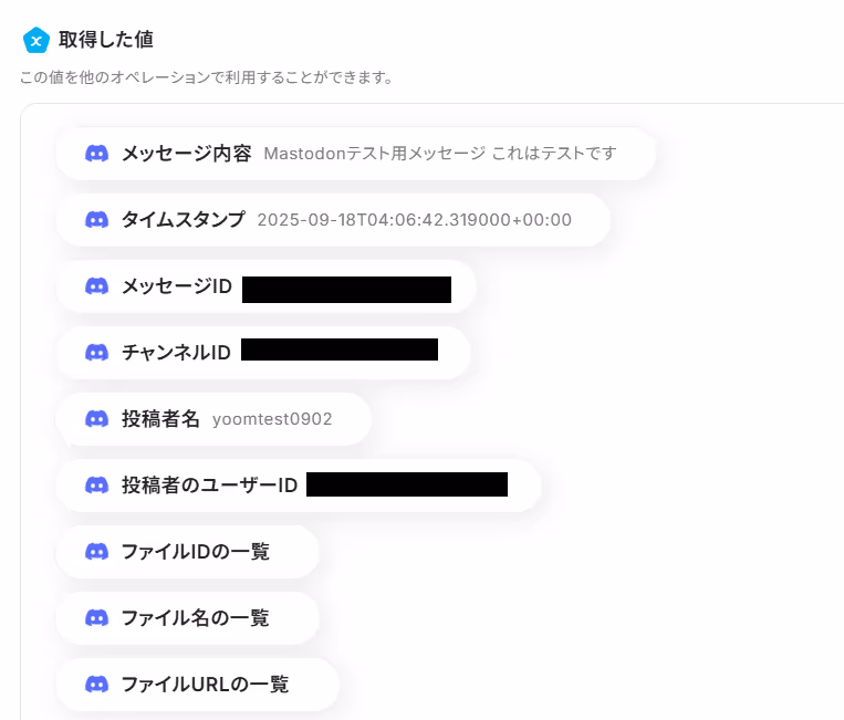 「取得した値」として、Discordに送信されたメッセージの内容が反映されていれば成功です!