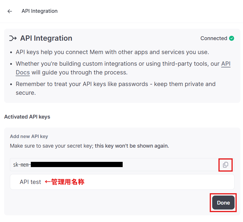 - APIの管理用名称を設定し、生成されたAPIキーをコピーしてから「Done」をクリック。