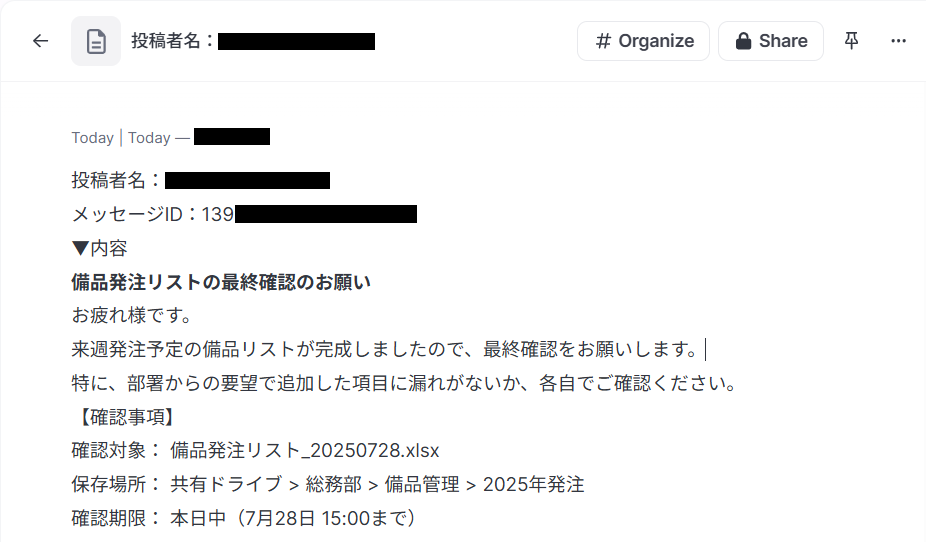 重要なアナウンスや議論の内容が自動的にナレッジベースへ集約されるため、手作業での転記漏れや手間を排除し、迅速な情報共有と蓄積を実現します。