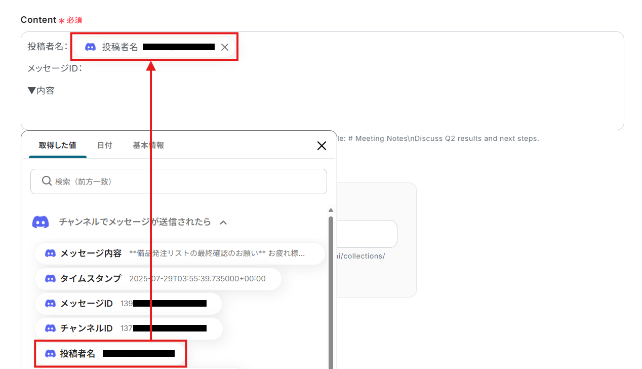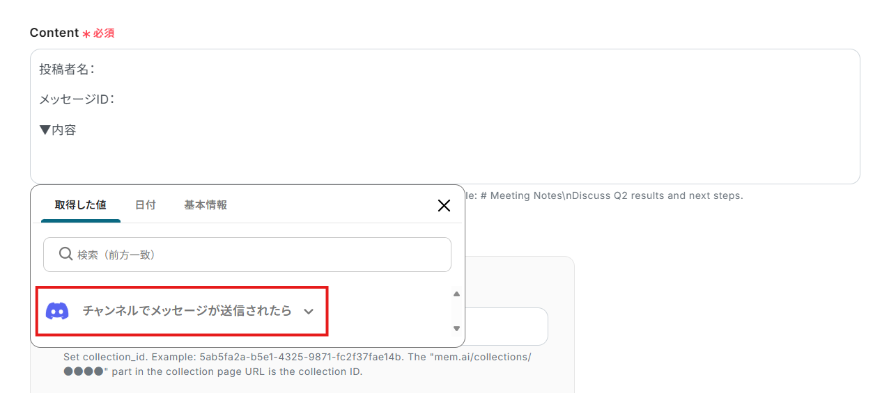 - Memのオペレーションでは、ノートを保存するコレクションIDを任意で設定できます。また、ノートの本文(Content)には、固定のテキストだけでなく、Discordのメッセージ内容などの動的な情報を変数として埋め込むことも可能です。