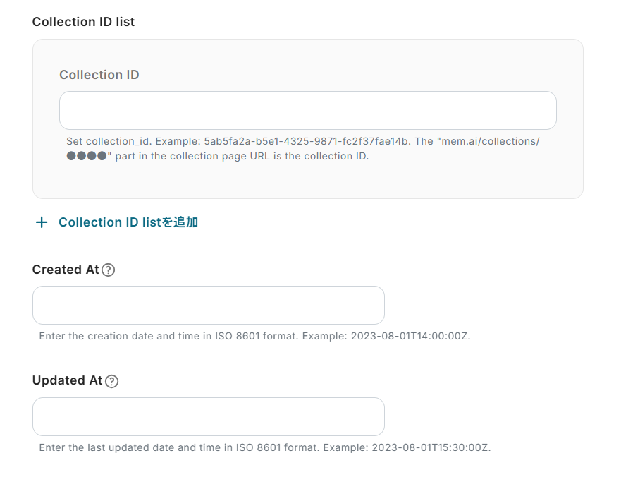 - MemへのNote作成時、保存先のコレクションIDを任意で設定できます。また、Noteの本文に固定テキストを追加したり、前段の処理で取得した値を動的に埋め込んだりすることも可能です。