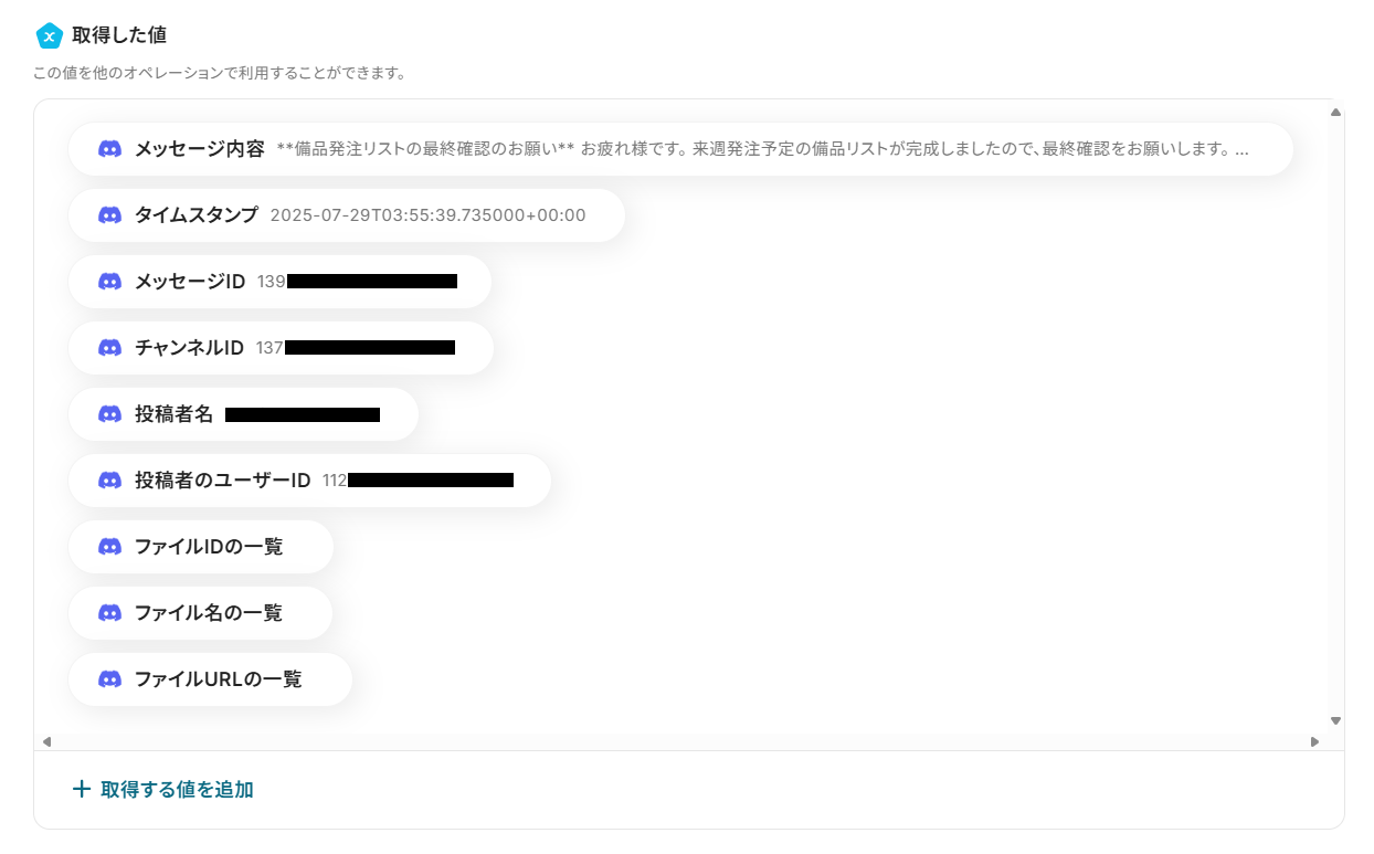 - 次に、オペレーションでDiscordの「メッセージ内のファイルをダウンロードする」アクションを設定します。