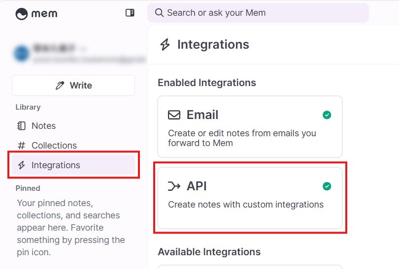 Memにログインし、サイドメニューの「Integrations」から「API」にアクセスします。