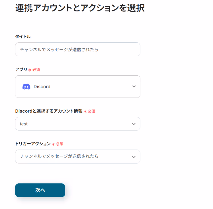 連携アカウントとアクションを選択する画面が表示されるので、今回連携するDiscordのアカウントを確認し「次へ」をクリックします。