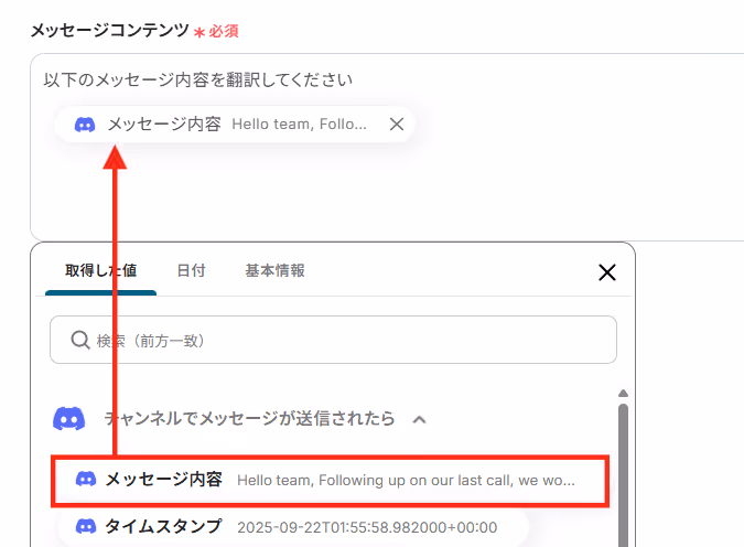 メッセージコンテンツには以下のようにDiscordから取得した値から「メッセージ内容」、OpenAIへの翻訳の指示を入力しましょう。