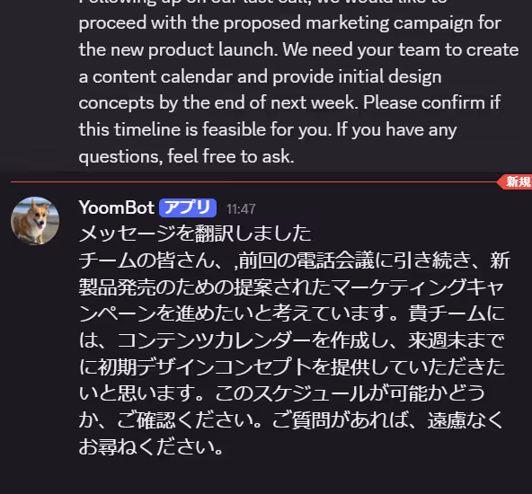 海外のメンバーや顧客とのコミュニケーションにおいて、Discord上のメッセージを手動で翻訳する手間を削減し、<span class="mark-yellow">言語の壁なく素早く円滑な意思疎通を可能にします。</span>